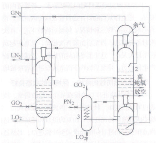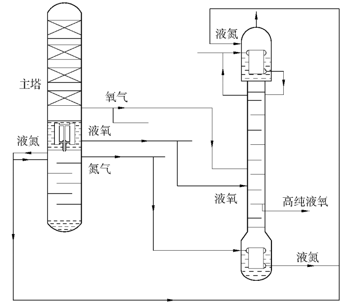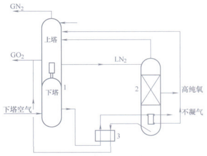 該流程采用原料氧以液相進料的單塔精餾制取高純氧的工藝流程,由于流程簡單,目前被廣泛應用于中大型空分設備上提取高純氧。配置在空分設備內的高純氧提取裝置,為建立高氧塔的正常工作工況,要從空分設備內的相應位置抽取較大量的熱源和冷源,由于這一抽取量占中大型空分設備中相應物流量的比例是不大的,所以空分設備能承受,不會影響空分設備正常工作。但是這種工藝流程高純氧的提取率通常偏低,主要看空分設備的承受能力。