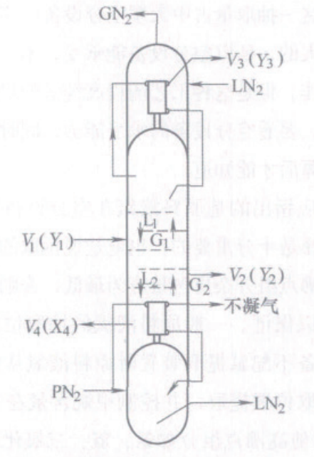 從空分設備主塔抽取的原料氣以接近飽和狀態從高氧塔Ⅰ下部進入,該塔采用液氮為冷源,氧氣在上升的過程中與下流的液體接觸進行熱質交換,高氧塔Ⅰ的主要作用是清除原料氧中大部分高沸點雜質如:氪、氙、二氧化碳和部分碳氫化合物。經高氧塔Ⅰ精餾后的氧氣由塔頂排出,但其中仍含有氮、氬、甲烷等低沸點組分雜質,這部分氧氣再被送入高氧塔Ⅱ的中部,在塔內進一步精餾提純。高氧塔Ⅱ設有上冷凝蒸發器和下冷凝蒸發器,采用壓力氮作熱源,液氮作冷源,氧經精餾后將含有大量低沸點組分雜質的氧氣由塔頂排出;對含有碳氫化合物等高沸點組分雜質的液氧由塔底抽出少量并經汽化排放出系統;產品高純氧由下冷凝蒸發器上方3~5塊板處抽取。在氣相進料的二塔流程中高純氧的提取率一般在20%~25%。由于該流程原料氧氣的純度為 99. 6% ,其優勢是比相應的單塔精餾流程產品提取率高。
