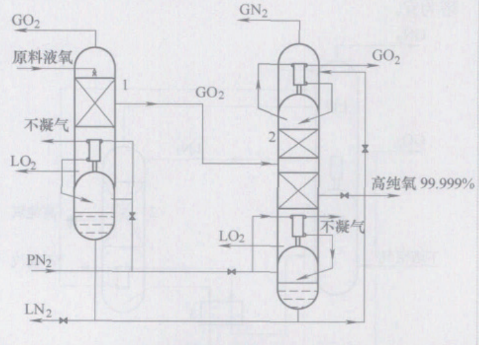 氣氧進料雙塔精餾制取高純氧雙塔精餾流程如圖 4所示。這種流程的特點是高純氧設備內置于大、中型空分設備的冷箱中,以上塔底部氧氣為原料。由于是氣態進料,Ⅰ塔底部一般不設置蒸發器。Ⅰ塔和Ⅱ塔的冷凝器所需冷源是空分設備的液氮,Ⅱ塔底部蒸發器所需熱源是空分設備下塔的壓力氮或壓力空氣。